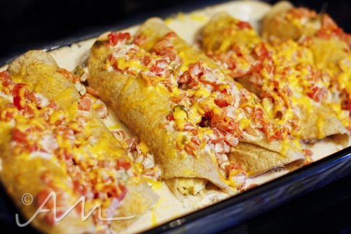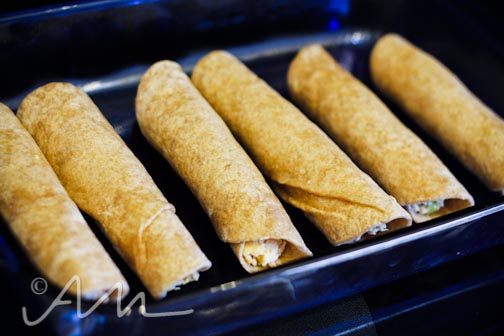 once well-mixed and cheese melted, turn off heat.  take a large spoonful of mixture and spread onto tortillas then wrap and place seal-side-down in a lightly greased baking pan {for this i take a paper towel dipped in a tad of real butter and lightly line the pan}.