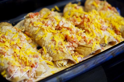 stir together well and pour over rolled tortillas.  sprinkle remaining cheese over top and pop in the oven.