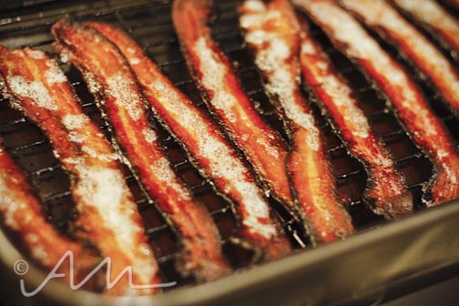 so, the best thing to do – is actually bake your bacon. hehe, that’s fun to say. bake your bacon. this time, i used the yummy black forest bacon i had on hand. if you place it on a cooling rack within your pan, it allows the bacon to cook and crisp up consistently all the way around – the heat distributes evenly and you don’t have to flip it! also, it’s healthier to cook it this way because a lot of the fat is collected in the pan below. keep your eye on it and cook until your desired crispiness. i baked mine for a good 30 minutes at about 400 degrees.