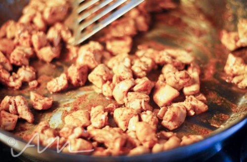 meat isn’t fun to photograph.  i don’t even eat it enough to really WANT or like to photograph it 🙂  but i just wanted to give you an idea on how your chicken should look when you brown it up.  i simply added about a tablespoon of butter to the pan and a little seasoning {“fiesta” they called it} then tossed in the chopped chicken bits.