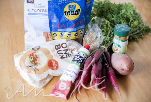 this dish was created because i always keep falafel in the house – it’s one of my protein staples, and i love love love it! i also had another bunch of the purple carrots – and i know they compliment sweet potatoes well. i had almond milk in the fridge, and i keep the spice on hand because i love curry spice! i didn’t have any tomatoes around, so i used tomato paste for a little extra flavour :