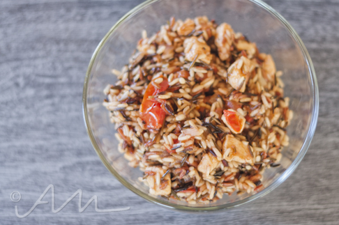 {wild rice with lemon chicken, shallots, and tomatoes}