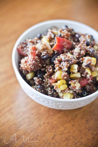 {meatless mondays : red quinoa with grape tomatoes, fresh corn, and black beans}